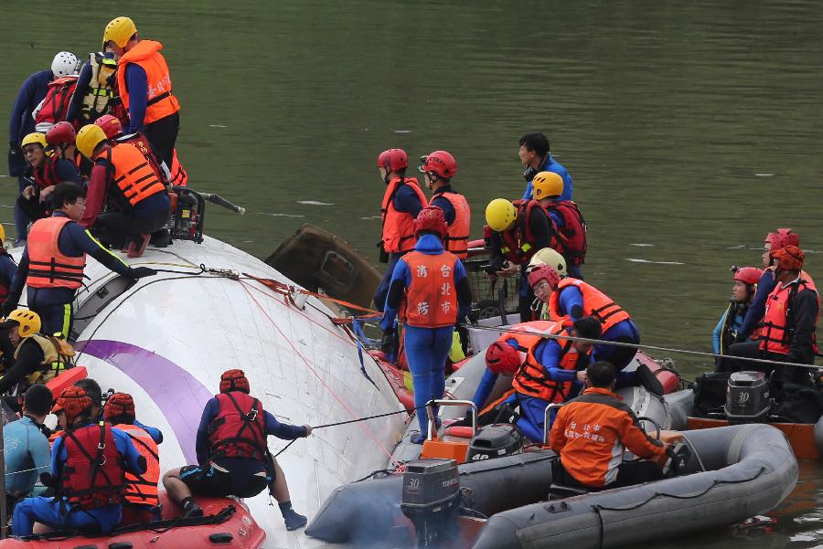 Rescuers carry out rescue operation after a plane plunged into a river in Taipei, southeast China's Taiwan, Feb. 4, 2015. A Taiwan TransAsia Airways plane crashed into a Taipei river on Wednesday morning, killing at least 12 people. Flight ATR-72, which was headed for Kinmen from Taipei, had 58 people on board, including 31 passengers from the Chinese mainland. It crash landed in the Keelung River after it clipped an elevated motorway with its wing. (Xinhua/Jin Liawng)