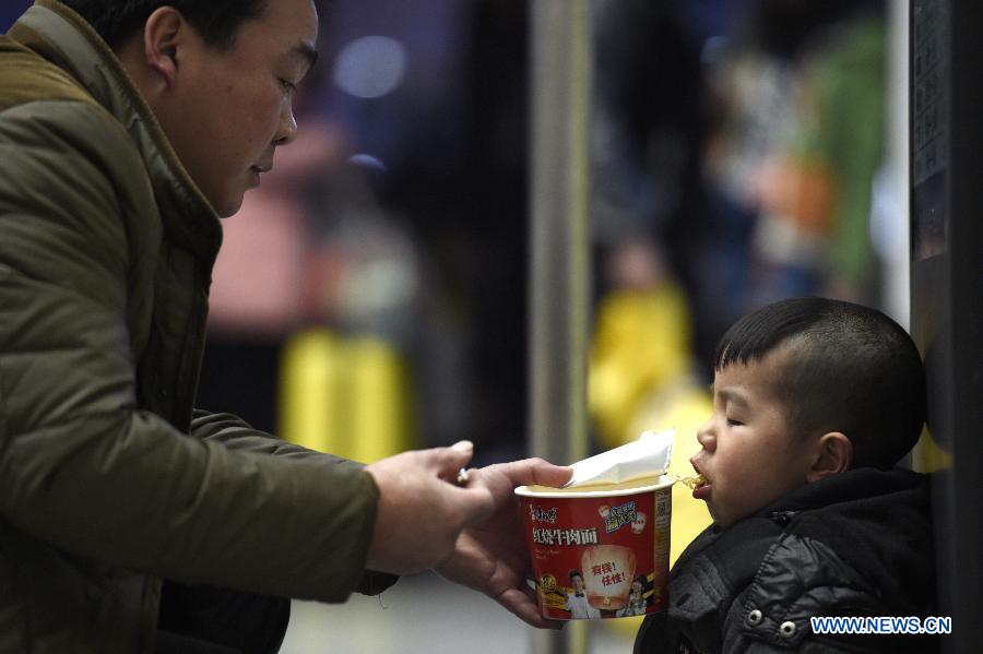 Tang Yong (L) feeds his three-year-old son instant noodle while waiting for a train heading to their hometown in southwest China's Guizhou Province at the railway station of Hangzhou, capital of east China's Zhejiang Province, Feb. 4, 2015. The 40-day travel frenzy known as "Chunyun", the hectic period surrounding Chinese New Year, or Spring Festival, which falls this year on Feb. 19, began on Wednesday and will last until March 16. (Xinhua/Ju Huanzong)
