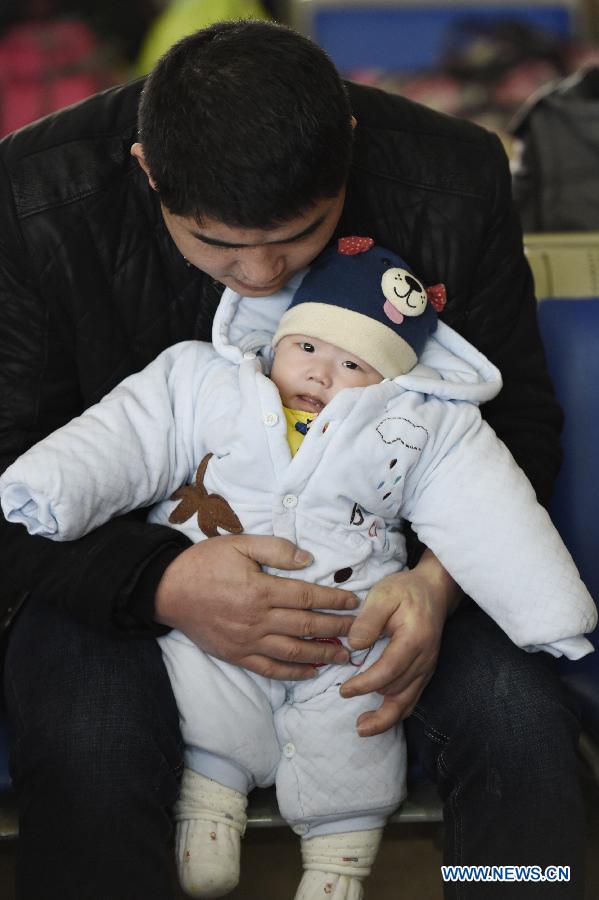 | Yang Changlin holds his three-month-old son Yang Shengkang while waiting for a train to their hometown in southwest China's Guizhou Province at the railway station of Hangzhou, capital of east China's Zhejiang Province, Feb. 4, 2015. The 40-day travel frenzy known as "Chunyun", the hectic period surrounding Chinese New Year, or Spring Festival, which falls this year on Feb. 19, began on Wednesday and will last until March 16. (Xinhua/Ju Huanzong) |