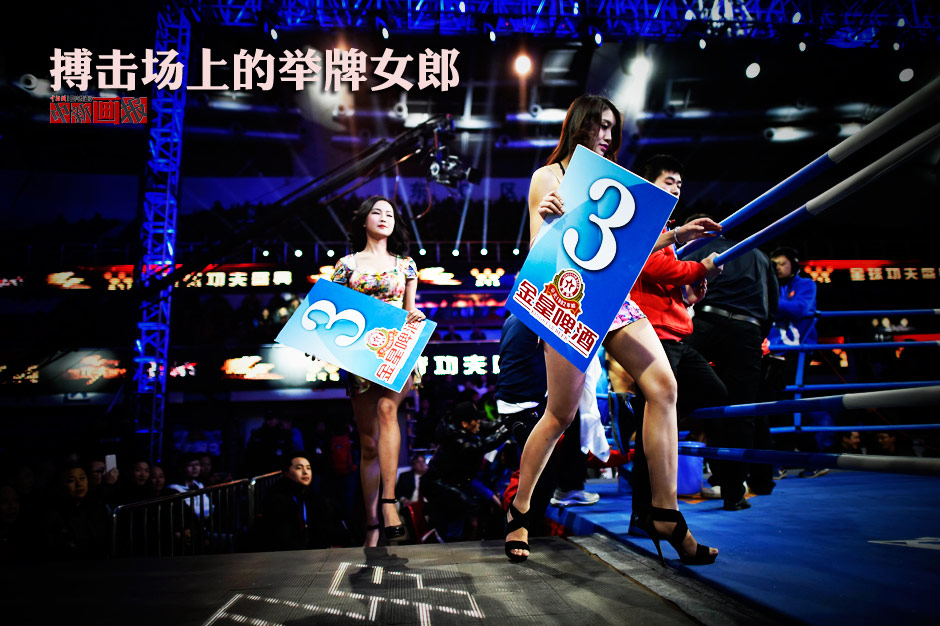 The final of “2014 Kong Fu Competition” is held in Jiangnan Stadium in southwest China’s Chongqing on Jan. 31, 2015. Contrasted with fighting muscle men, the charming octagon girls who showed the number of rounds were especially eye-catching. (Chinanews/Dao Cao)