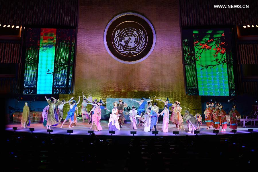 Artists perform during a Chinese Dance Drama entitled "The Dream of the Maritime Silk Road", at the United Nations headquarters in New York on Feb. 4, 2015. (Xinhua/Niu Xiaolei)