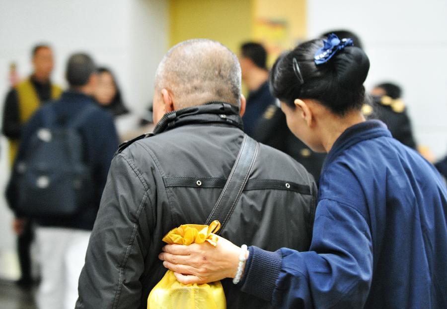 A family member of a mainland passenger, helped by a volunteer, walks into Xiamen Gaoqi International Airport in Xiamen, southeast China's Fujian Province, Feb. 5, 2015. Sixteen of the 31 confirmed deaths in the Taiwan TransAsia Airways plane crash were Chinese mainland residents. As of 9:45 a.m. Thursday, the fatal crash had left 31 dead, 15 with injuries, and 12 missing. All the missing passengers are tourists from the Chinese mainland. Three other mainland passengers were injured. Family members of these mainland passengers have already been arranged to go to Taiwan. (Xinhua/Lin Shanchuan)