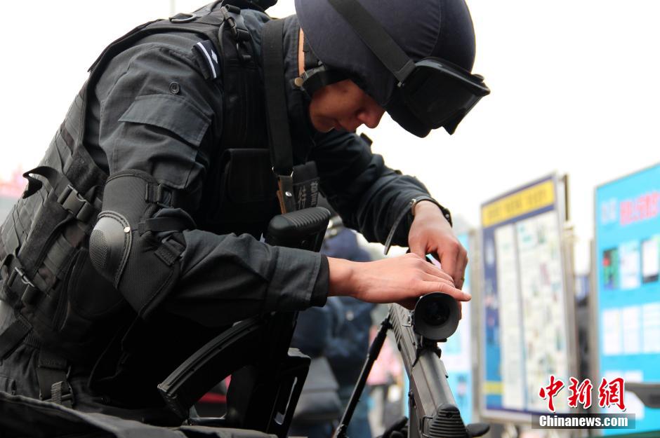 A police officer shows the anti-terrorism equipment at the railway station in Xi'an on Feb. 3, 2015. (CNS/Ma Zhifeng)