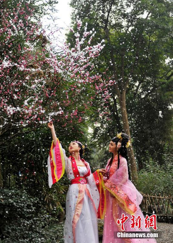 Two girls in ancient costumes enjoy themselves amidst the plum blossoms at Du Fu's Thatched Cottage in Chengdu, southwest China's Sichuan province. The blooming flowers have attracted many tourists to come and enjoy the natural beauty. (CNS/An Yuan)