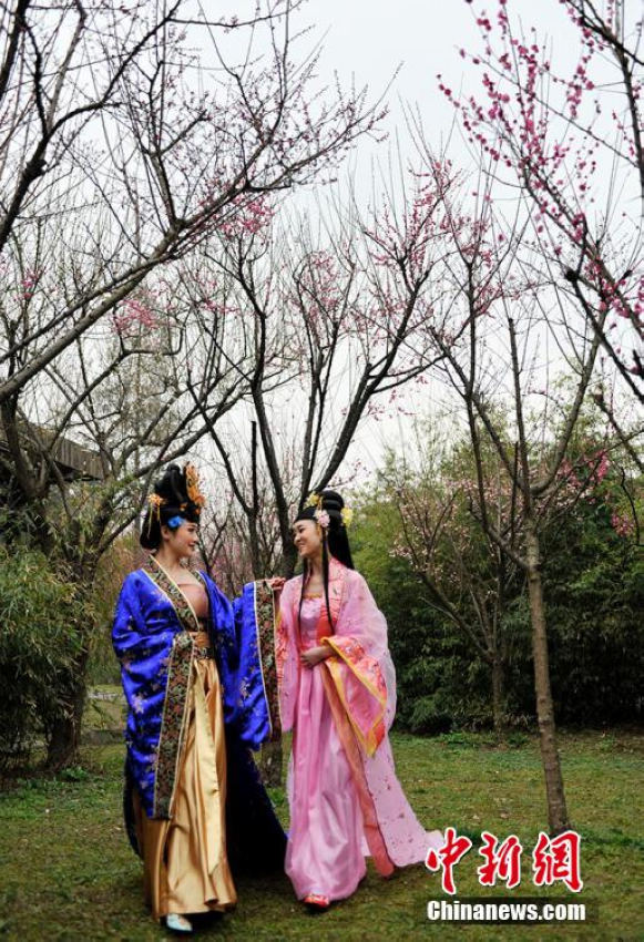 Two girls in ancient costumes enjoy themselves amidst the plum blossoms at Du Fu's Thatched Cottage in Chengdu, southwest China's Sichuan province. The blooming flowers have attracted many tourists to come and enjoy the natural beauty. (CNS/An Yuan)