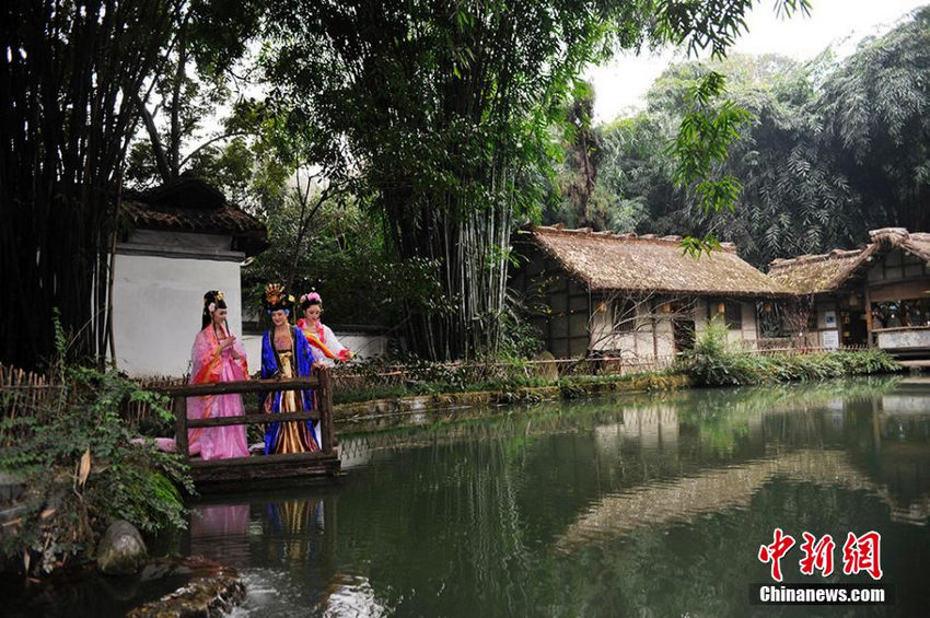 Three girls in ancient costumes enjoy themselves amidst the plum blossoms at Du Fu's Thatched Cottage in Chengdu, southwest China's Sichuan province. The blooming flowers have attracted many tourists to come and enjoy the natural beauty. (CNS/An Yuan)