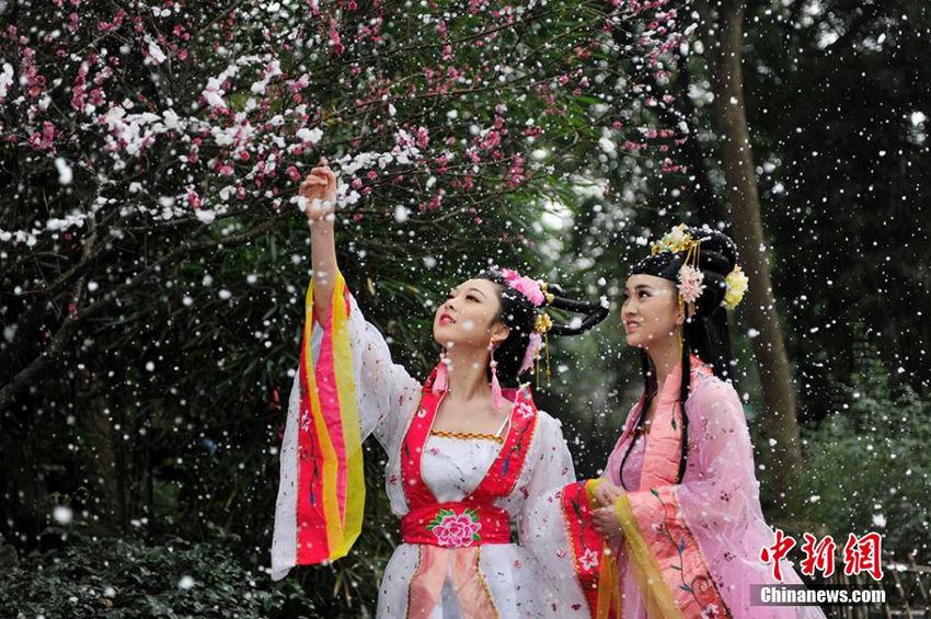 Two girls in ancient costumes enjoy themselves amidst the plum blossoms at Du Fu's Thatched Cottage in Chengdu, southwest China's Sichuan province. The blooming flowers have attracted many tourists to come and enjoy the natural beauty. (CNS/An Yuan)