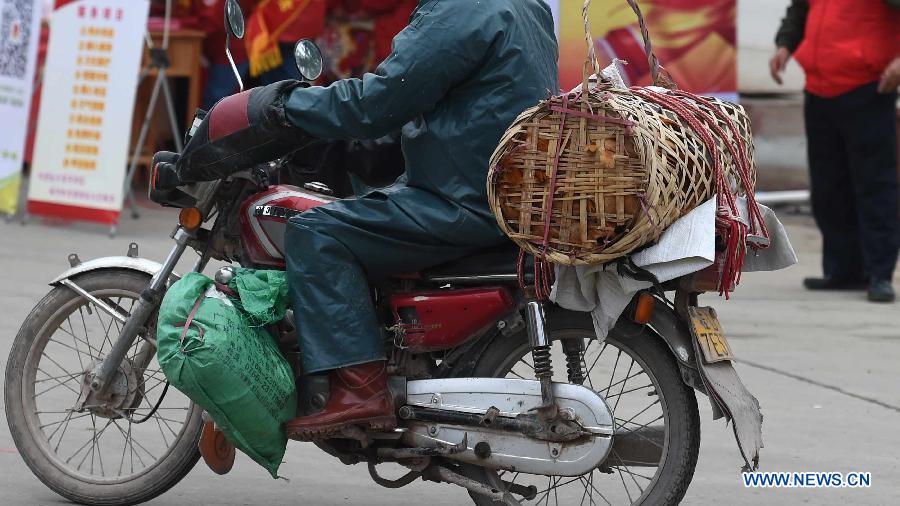 Photo taken on Feb. 5, 2015 shows a man returning home by motorcycle on the Wuzhou section of 321 national highway in south China's Guangxi Zhuang Autonomous Region. Many migrant workers in Guangxi chose to ride motorcycles back home for Spring Festival. The 40-day travel frenzy known as "Chunyun", the hectic period surrounding Spring Festival, which falls this year on Feb. 19, began on Feb. 4 and will last until March 16. (Xinhua/Huang Xiaobang)