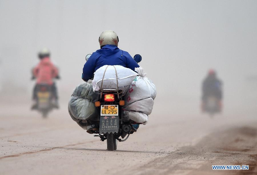 Photo taken on Feb. 5, 2015 shows a man returning home by motorcycle on the Wuzhou section of 321 national highway in south China's Guangxi Zhuang Autonomous Region. Many migrant workers in Guangxi chose to ride motorcycles back home for Spring Festival. The 40-day travel frenzy known as "Chunyun", the hectic period surrounding Spring Festival, which falls this year on Feb. 19, began on Feb. 4 and will last until March 16. (Xinhua/Huang Xiaobang)
