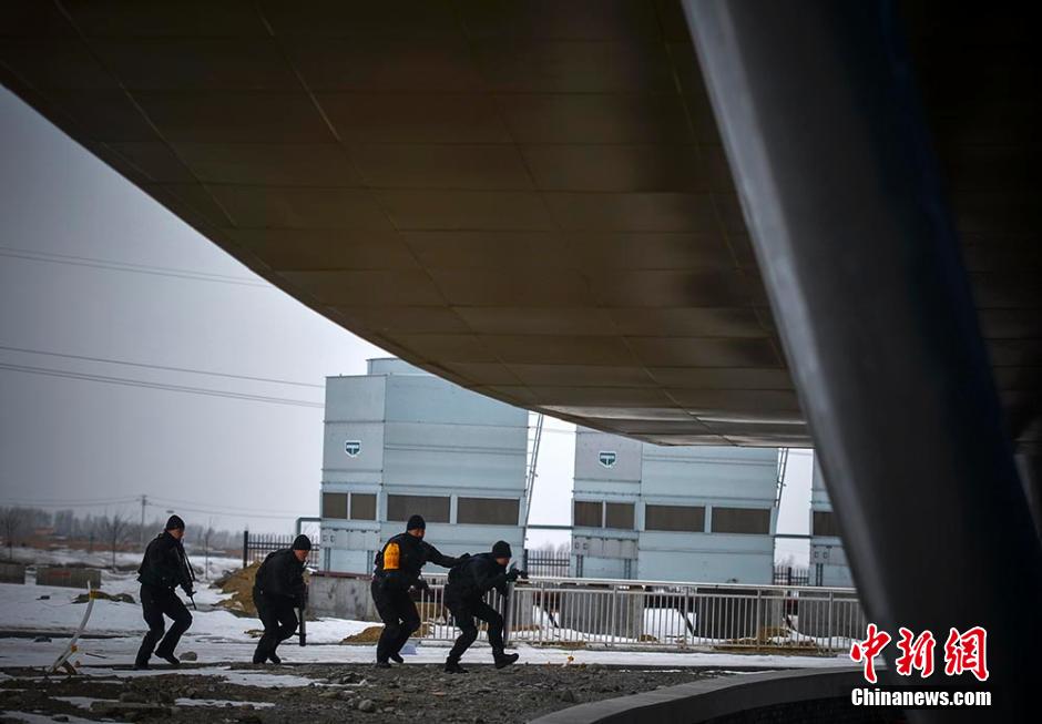 About 100 SWAT members take part in an anti-terror drill at the stadiums for the 13th National Winter Games in Urumqi, northwest China's Xinjiang Uyghur Autonomous Region on Feb. 4, 2015. The 13th National Winter Games will be held in January 2016 in Urumqi. The construction of the sports venues has already been completed. (CNS/Fang Tao)