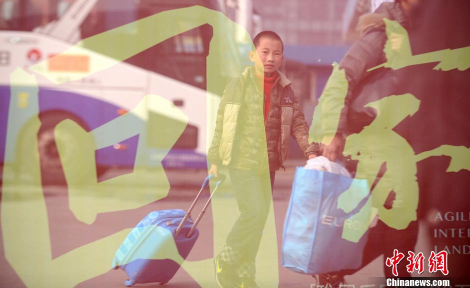 A boy walks with his family at Yanghzou West Bus Station, east China's Jiangsu province, Feb. 4, 2015. The 40-day travel frenzy known as "Chunyun", the hectic period surrounding Chinese New Year, or the Spring Festival, which falls this year on Feb. 19, began on Wednesday and will last until March 16. (CNS/Meng Delong)
