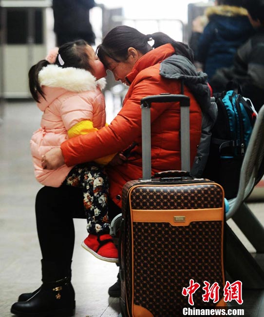 A girl waits for a bus with her mother at Yanghzou West Bus Station, east China's Jiangsu province, Feb. 4, 2015. The 40-day travel frenzy known as "Chunyun", the hectic period surrounding Chinese New Year, or the Spring Festival, which falls this year on Feb. 19, began on Wednesday and will last until March 16. (CNS/Meng Delong)