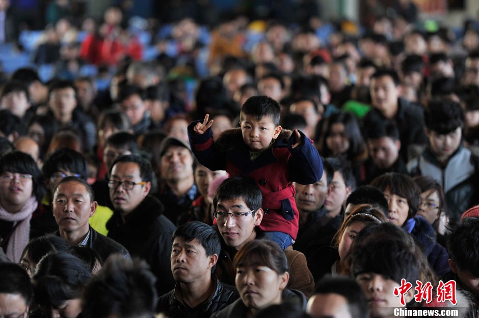 A boy sits on his father's shoulder at Taiyuan Railway Station, north China's Shanxi province, Feb. 4, 2015. The 40-day travel frenzy known as "Chunyun", the hectic period surrounding Chinese New Year, or the Spring Festival, which falls this year on Feb. 19, began on Wednesday and will last until March 16. (CNS/Wei Liang)