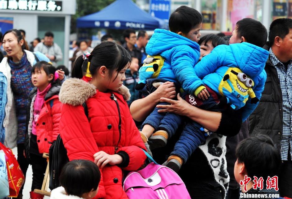 Two boys travel with their family at Fuzhou Railway Station, southeast China's Fujian province, Feb.3, 2015. (CNS/Zhang Bin)