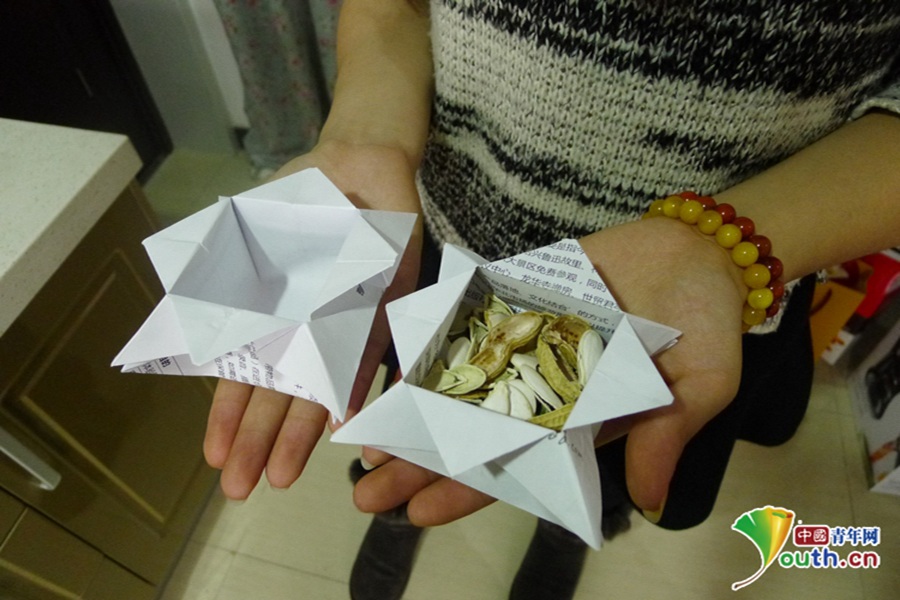 Xiao Ji uses waste paper to make 'garbage can'. (Youth.cn/Gao Lei)