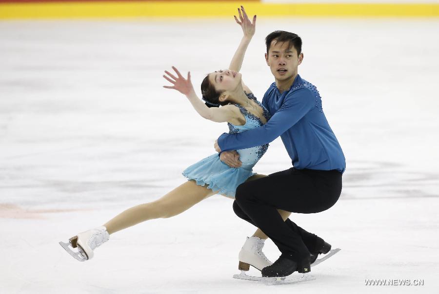 Yu Xiaoyu (L) and Jin Yang perform during the final of pairs free skating at the 27th World Winter Universiade in Granada, Spain, Feb. 7, 2015. The Chinese pair claimed the title with 181.92 points in the event, the first gold medal of the Chinese delegation. (Xinhua/Meng Yongmin)