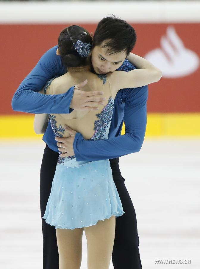 Yu Xiaoyu (Front) and Jin Yang hug to celebrate after the final of pairs free skating at the 27th World Winter Universiade in Granada, Spain, Feb. 7, 2015. The Chinese pair claimed the title with 181.92 points in the event, the first gold medal of the Chinese delegation. (Xinhua/Meng Yongmin)