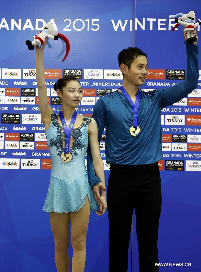 | Yu Xiaoyu (front) and Jin Yang perform during the final of pairs free skating at the 27th World Winter Universiade in Granada, Spain, Feb. 7, 2015. The Chinese pair claimed the title with 181.92 points in the event, the first gold medal of the Chinese delegation. (Xinhua/Fei Maohua) |