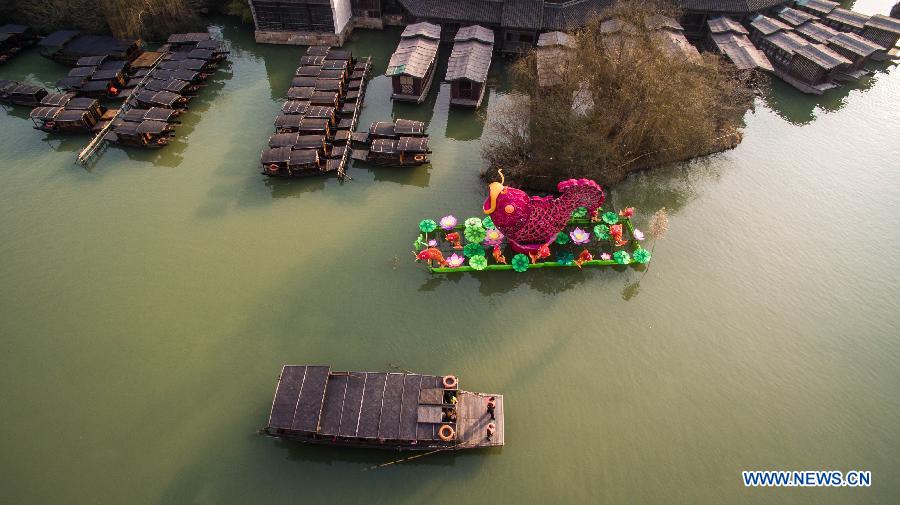 Photo taken on Feb. 6, 2015 shows the festival lanterns in Wuzhen, east China's Zhejiang Province. About twenty groups of festival lanterns were set in the town to celebrate the coming Chinese New Year, or Spring Festival, which falls this year on Feb. 19. (Xinhua/Xu Yu)