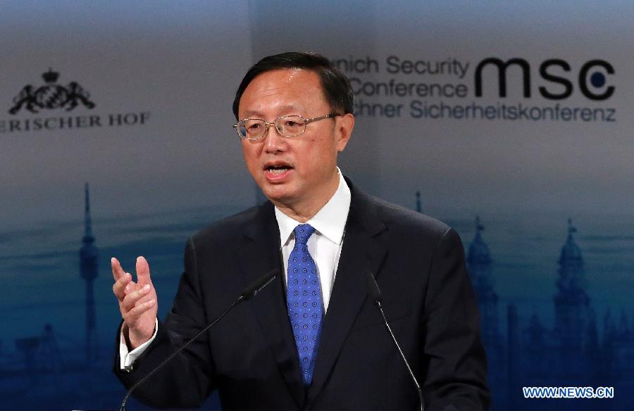 | Chinese State Councilor Yang Jiechi speaks at the opening panel of the 51st Munich Security Conference (MSC) in Munich, Germany, Feb. 6, 2015. China on Friday called for fostering a vision of a common, comprehensive, cooperative and sustainable security, said Yang Jiechi in Munich. (Xinhua/Luo Huanhuan) |