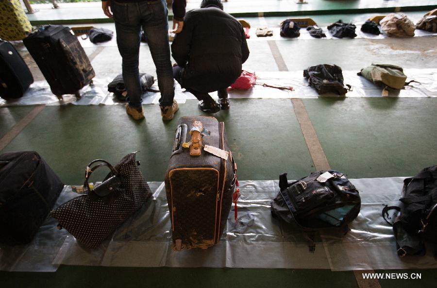 | People claim the belongings of victims of the plane crash in Taipei, southeast China's Taiwan, Feb. 7, 2015. A plane of TransAsia Airways crashed in the Keelung River Wednesday morning after its wing clipped a taxi on an elevated freeway 10 minutes following takeoff. (Xinhua/Jin Liwang) |