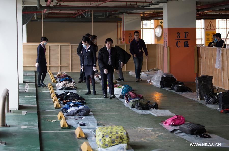 People claim the belongings of victims of the plane crash in Taipei, southeast China's Taiwan, Feb. 7, 2015. A plane of TransAsia Airways crashed in the Keelung River Wednesday morning after its wing clipped a taxi on an elevated freeway 10 minutes following takeoff. (Xinhua/Jin Liwang)
