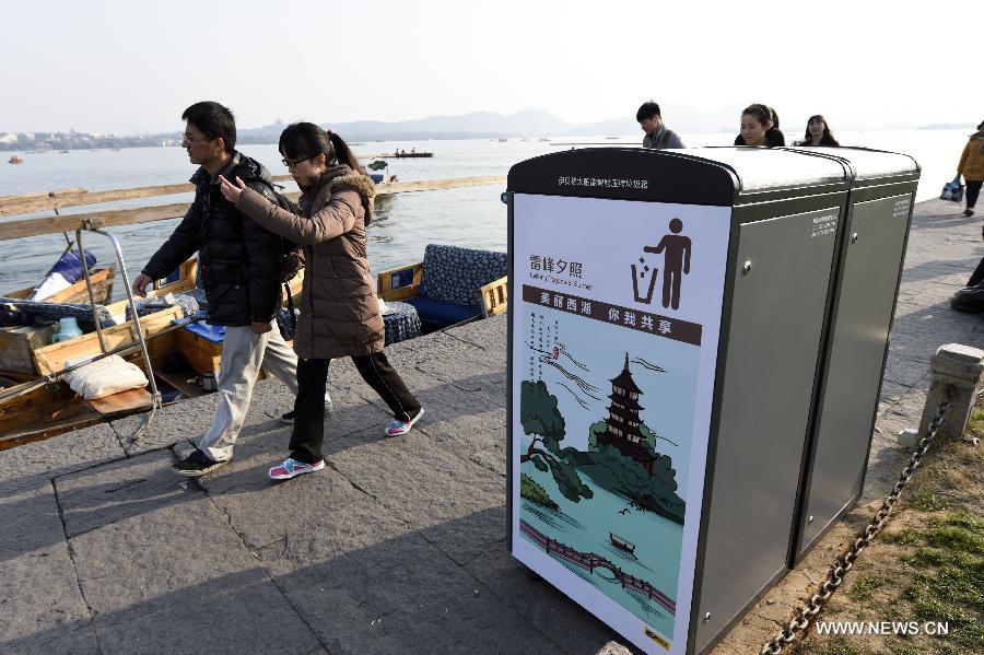 People walk past a solar power aptitude compressing dustbin newly set in the West Lake scenic spot in Hangzhou, capital of east China's Zhejiang Province, Feb. 7, 2015. Ten suits of solar power aptitude compressing dustbins were set here on Saturday, which could automatically compress trashes thrown in. (Xinhua/Ju Huanzong)
