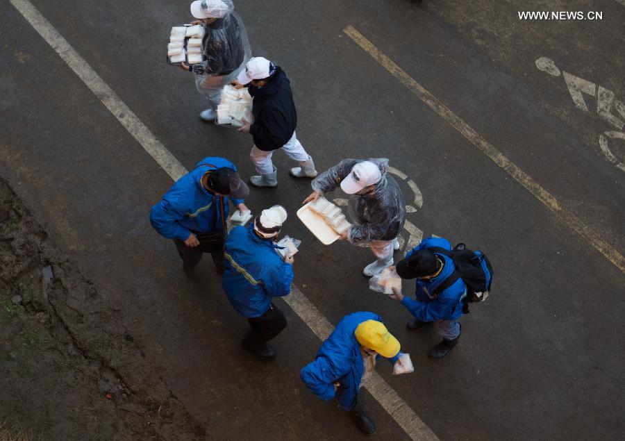 | Volunteers provide food to rescue workers in Taipei, southeast China's Taiwan, Feb. 8, 2015. Non-governmental organizations provided free food to rescue workers since the TransAsia Airways plane crashed on Feb. 4. (Xinhua/Jin Liwang) |