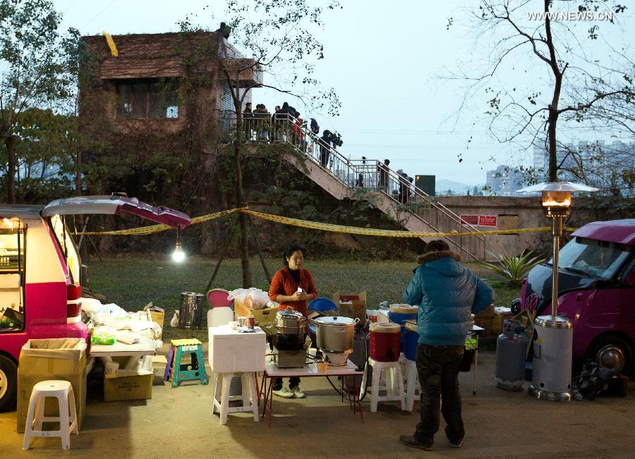 A volunteer provides food to a journalist in Taipei, southeast China's Taiwan, Feb. 8, 2015. Non-governmental organizations provided free food to rescue workers since the TransAsia Airways plane crashed on Feb. 4. (Xinhua/Jin Liwang)