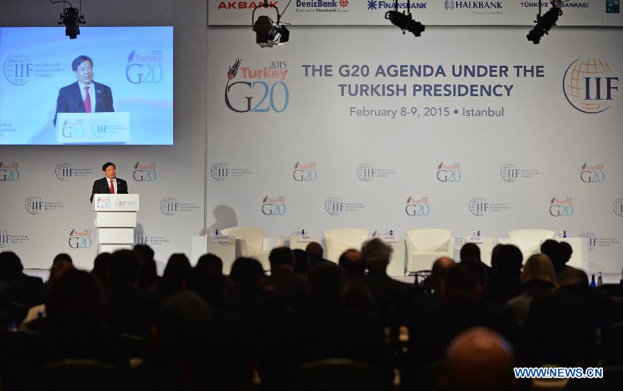Chinese Deputy Finance Minister Zhu Guangyao addresses financial officials and bankers from more than 40 countries just ahead of the first Ministerial Meeting of the Turkish G20 Presidency in Istanbul, Turkey on Feb. 8, 2015. The global economy faces big and crucial challenges with uncertainty and complexity in 2015, Zhu Guangyao said in the international financial meeting here on Sunday. (Xinhua/Lu Zhe)