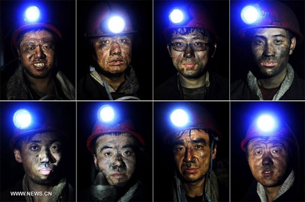 Combo photo taken on April 22, 2014 shows the portraits of miners in a coal mine in north China's Shanxi province. [Photo: Xinhua]