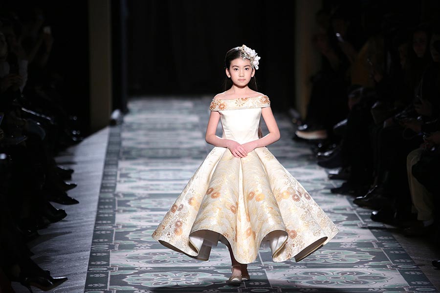 Xiuqiu, a nine-year-old Chinese girl, appears at the 2015 Haute Couture Spring-Summer collection fashion show in Paris. The girl is the first Chinese child model at Paris fashion show. She has won high appreciation from the fashion circle with her unique Chinese character and professional presentation. (Photo/Xinhua)