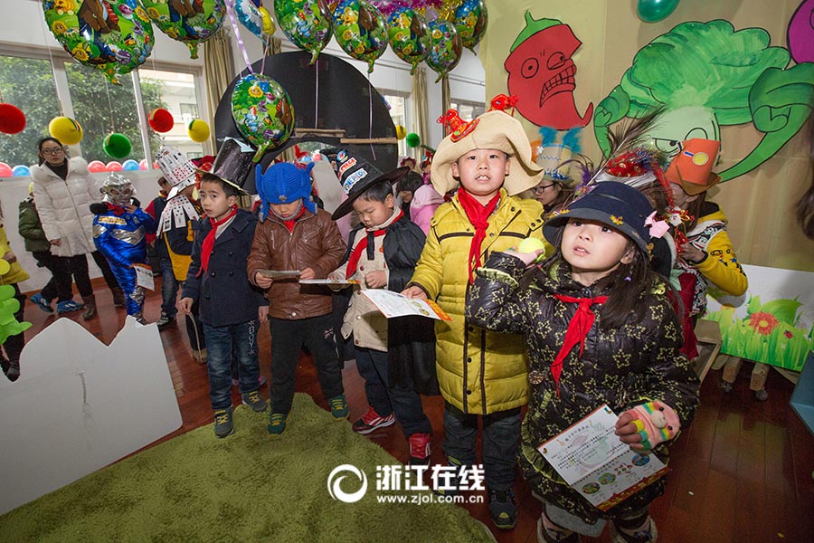 Students of Hangzhou Tianhang Experimental Primary School in east China’s Zhejiang province hold an interesting hat party on Feb. 3, 2015. The final exams for junior grades have been canceled for three years. Instead, all kinds of activities are held to inspire children’s innovative thinking. Their hats are made from newspapers, milk boxes, playing cards, plasticines and many other materials. (Photo source:zjol.com.cn)