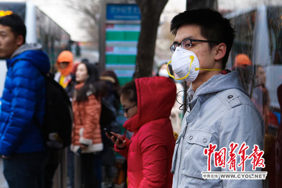 A boy waits for bus at Foreign Trade University bus stop in a smog shrouded day. (Photo/China Youth Daily)