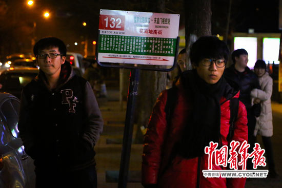 Students who prepare for the art examination wait for bus at Huajiadi south street bus stop. There are many art training schools near the Central Academy of Fine Arts. (Photo/China Youth Daily)