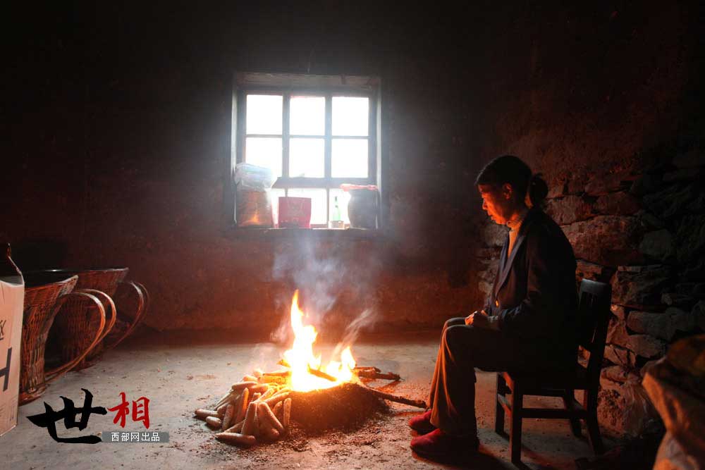 Zhu Changlong's wife dries the ears of maize at the fire.(cnwest.com/Wei Yongxian)