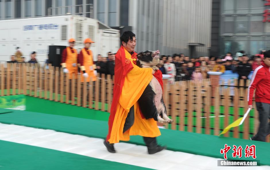 A fun race is held in Changsha, central China’s Hunan province on Feb. 8, 2015. The participants were required to run on a 20 meters long ice track with a pig in arms and kiss the pig at the end point. (Chinanews/Yang Huafeng)