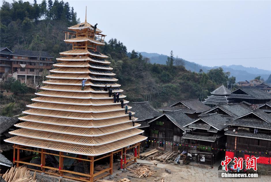 Dong people (a minority of China) build a drum tower to welcome the Chinese New Year in Pingyan village of Sanjiang county, south China’s Guangxi Zhuang autonomous region on Feb. 7, 2015. The drum tower is regarded as the soul of a Dong village and the construction is funded by all the villagers. (Chinanews/Gong Pukang)