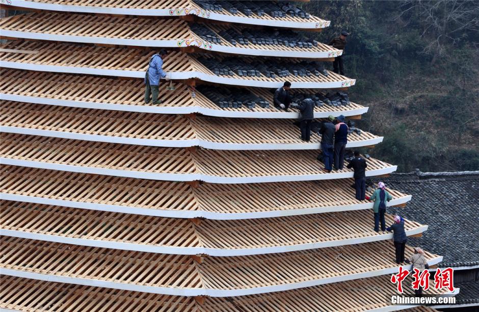 Dong people (a minority of China) build a drum tower to welcome the Chinese New Year in Pingyan village of Sanjiang county, south China’s Guangxi Zhuang autonomous region on Feb. 7, 2015. The drum tower is regarded as the soul of a Dong village and the construction is funded by all the villagers. (Chinanews/Gong Pukang)