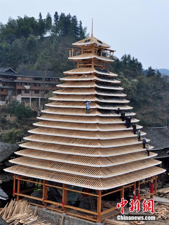 | Dong people (a minority of China) build a drum tower to welcome the Chinese New Year in Pingyan village of Sanjiang county, south China’s Guangxi Zhuang autonomous region on Feb. 7, 2015. The drum tower is regarded as the soul of a Dong village and the construction is funded by all the villagers. (Chinanews/Gong Pukang) |