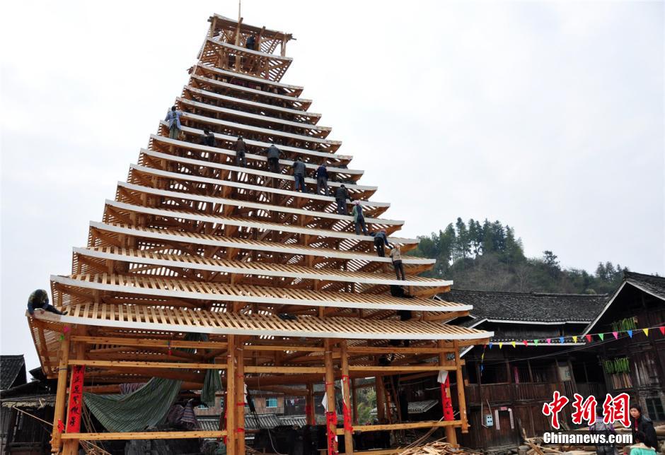 Dong people (a minority of China) build a drum tower to welcome the Chinese New Year in Pingyan village of Sanjiang county, south China’s Guangxi Zhuang autonomous region on Feb. 7, 2015. The drum tower is regarded as the soul of a Dong village and the construction is funded by all the villagers. (Chinanews/Gong Pukang)