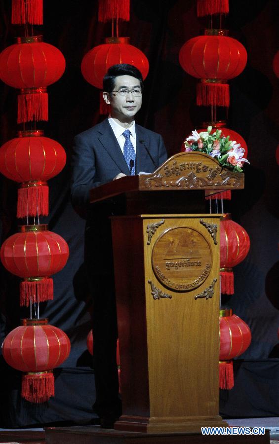 Zhao Jin, member of the Standing Committee of the Chinese Communist Party of Yunnan Province and head of Information Department of the province, speaks during the opening ceremony of the 2015 Spring Festival Night Show of Cambodia-China relations in Phnom Penh, capital of Cambodia, on Feb. 10, 2015. Approximately 200 Chinese and Cambodian artists on Tuesday evening performed here during the 2015 Spring Festival Night Show. (Xinhua/Sovannara)