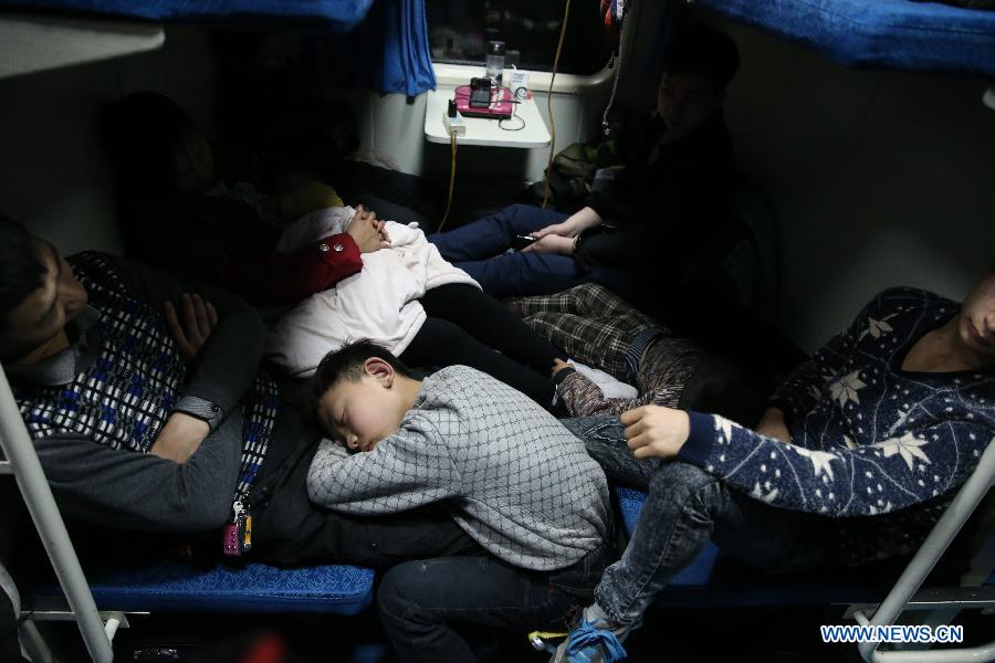 Passengers have a sleep on train 3663, which runs from east China's Shanghai to Chengdu, capital of southwest China's Sichuan Province, on Sept. 9, 2015. The Spring Festival, or the Chinese lunar New Year which starts from Feb. 19 this year, is known as the world's biggest migration, with millions of people traveling vast distances for family reunions. (Xinhua/Ding Ting)