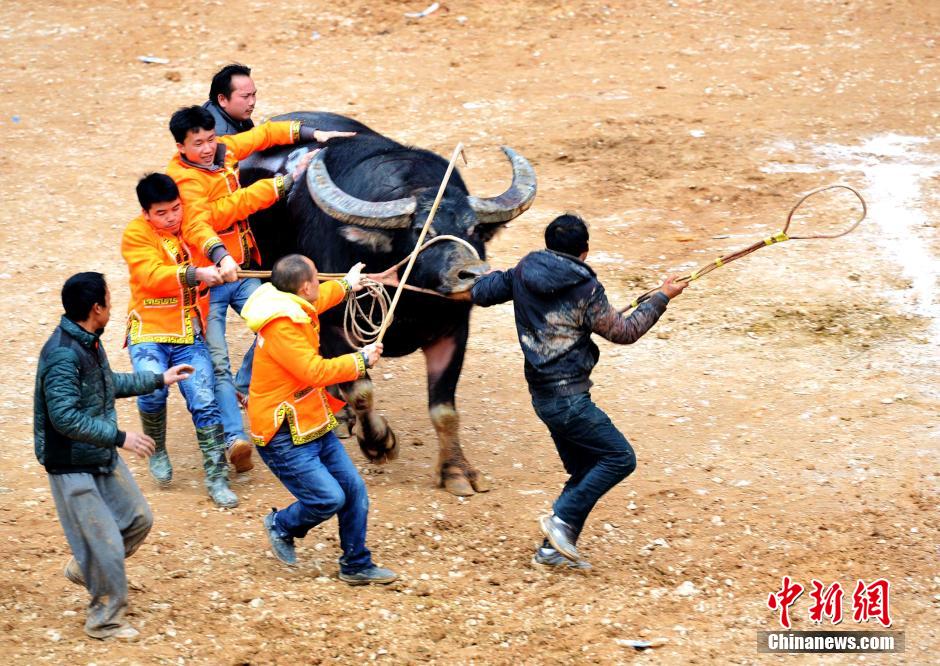 | The “2015 International Bull Fighting Competition” is held in southwest China’s Guizhou province on Feb. 8, 2015. Over 130 fighting bulls from China, Vietnam, Laos, Thailand and other countries participated in the competition. (Chinanews/Lin Shizhen) |