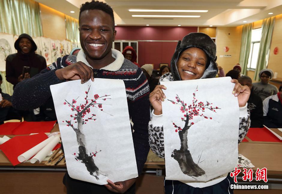 African students in Nanjing Agricultural University learn to write Chinese characters "goat" and "happiness" with brushes to celebrate the upcoming Year of the Goat on Feb. 9, 2015. (Photo/Yang Bo)