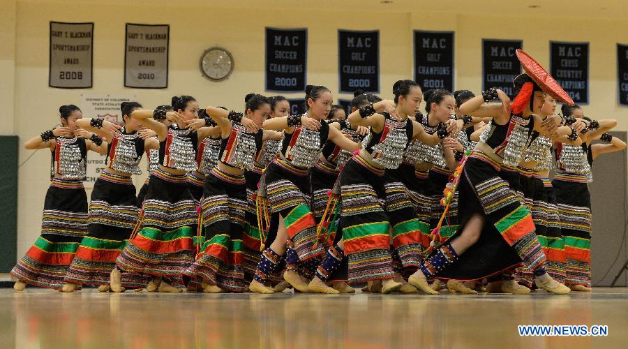 Students from the High School Affiliated to Renmin University of China perform to celebrate the upcoming Chinese lunar New Year, in Washington Feb. 12, 2015. (Xinhua/Bao Dandan)