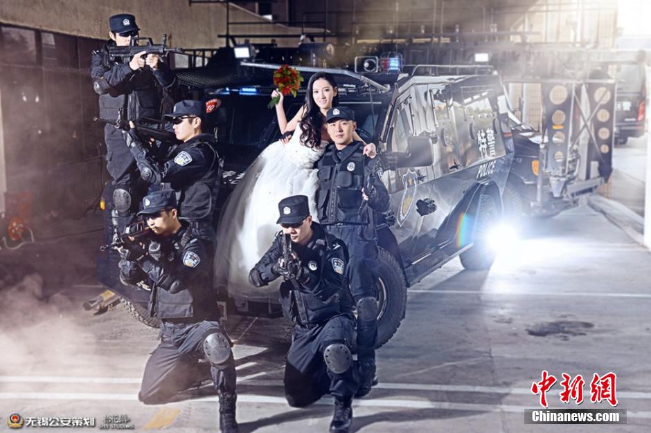 The Public Security Bureau of Wuxi city posts a series of cool wedding photos of policemen on its official Weibo account on Feb. 10, 2015. 11 policemen from different units took their wedding photos in uniforms. (Photo provided by Wuxi police department)