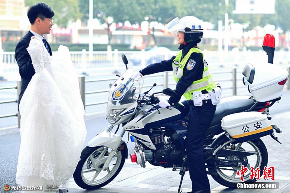 The Public Security Bureau of Wuxi city posts a series of cool wedding photos of policemen on its official Weibo account on Feb. 10, 2015. 11 policemen from different units took their wedding photos in uniforms. (Photo provided by Wuxi police department)