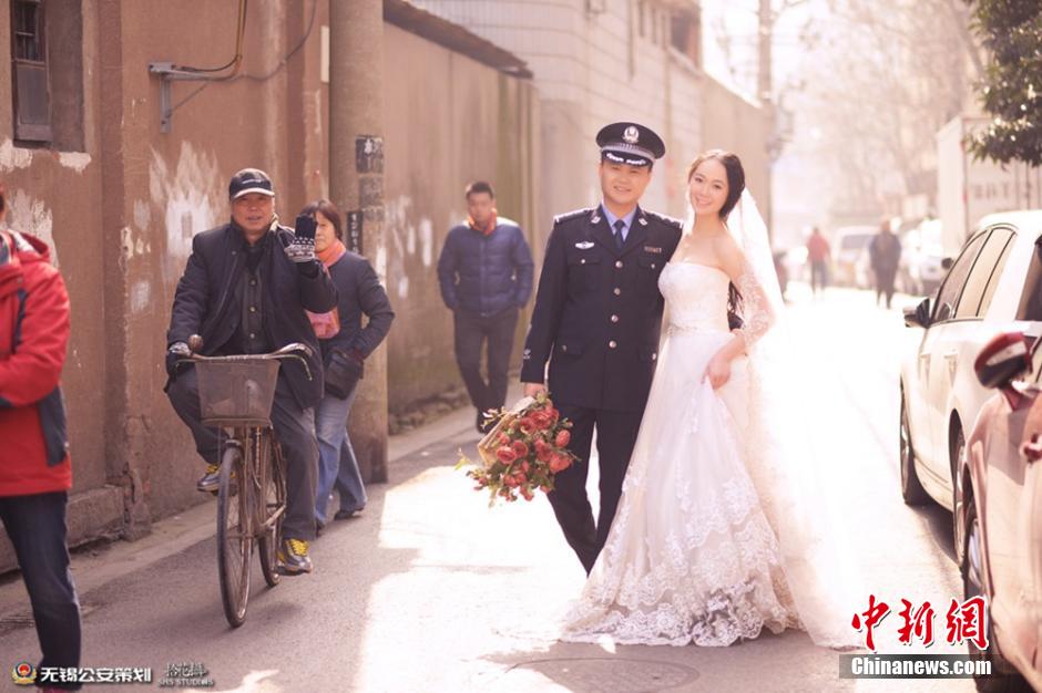 The Public Security Bureau of Wuxi city posts a series of cool wedding photos of policemen on its official Weibo account on Feb. 10, 2015. 11 policemen from different units took their wedding photos in uniforms. (Photo provided by Wuxi police department)