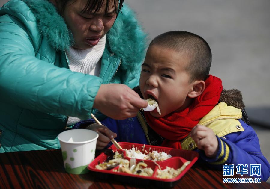 Qiu Hai, 5, eats the free meal provided by the gas station in Longyan, southeast China’s Fujian province on Feb. 9, 2015. He went home with his parents from Quanzhou to Ganzhou, east China’s Jiangxi province. (Xinhua/Wang Shen)